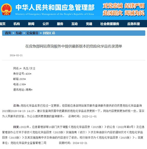 咨询:危险化学品名录已经过一定更新,但目前应急部网站首页服务查询服务提供的仍然是危险化学品查询2015版2018-04-19 14:27。建议在查询页面中把最新的危险化学品名录更新一下,网站内容更新更加积极一些,落实为人民服务的宗旨,为公众提供更便捷的查询服务。